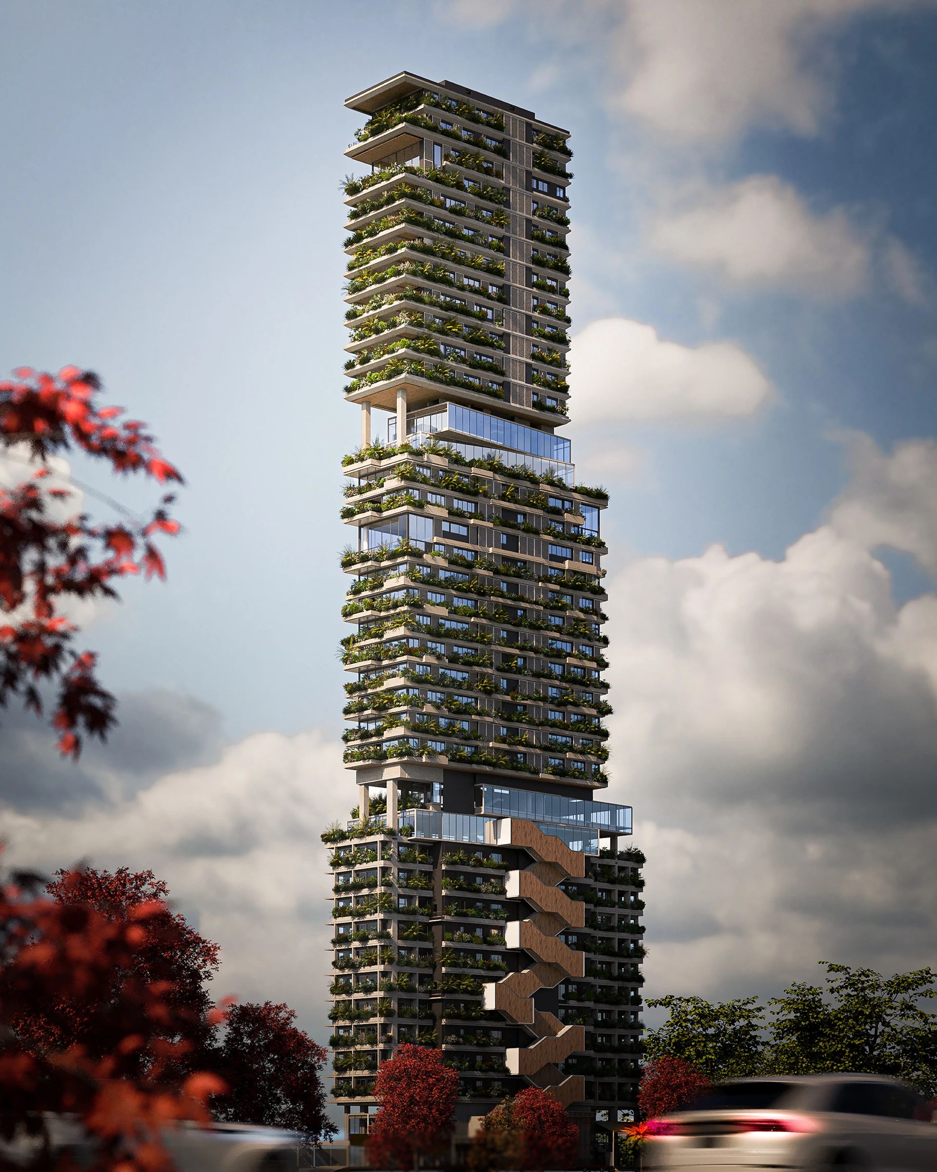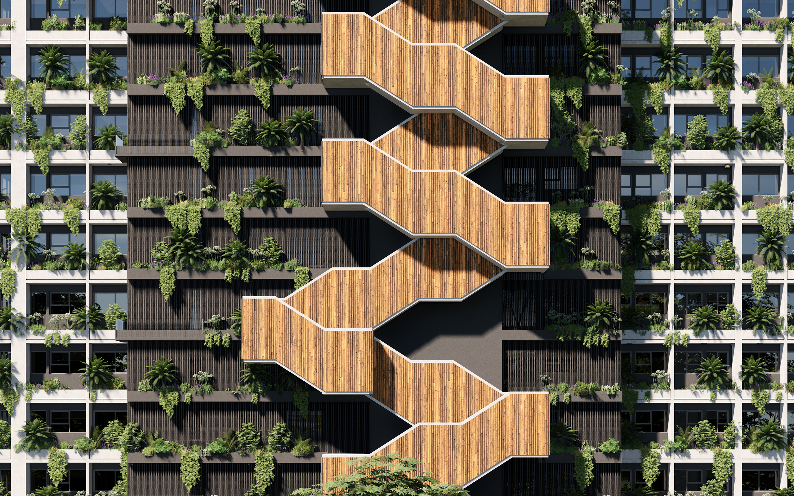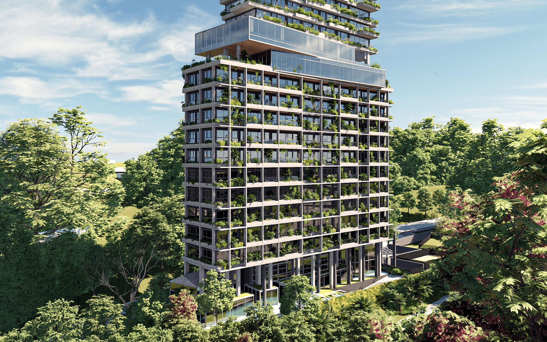 Grande torre com vegetação nativa nas fachadas e térreo, e Floresta de Bolso de Araucárias. Arquitetura Architects Office SP. Incorporadora AG7. 2021.